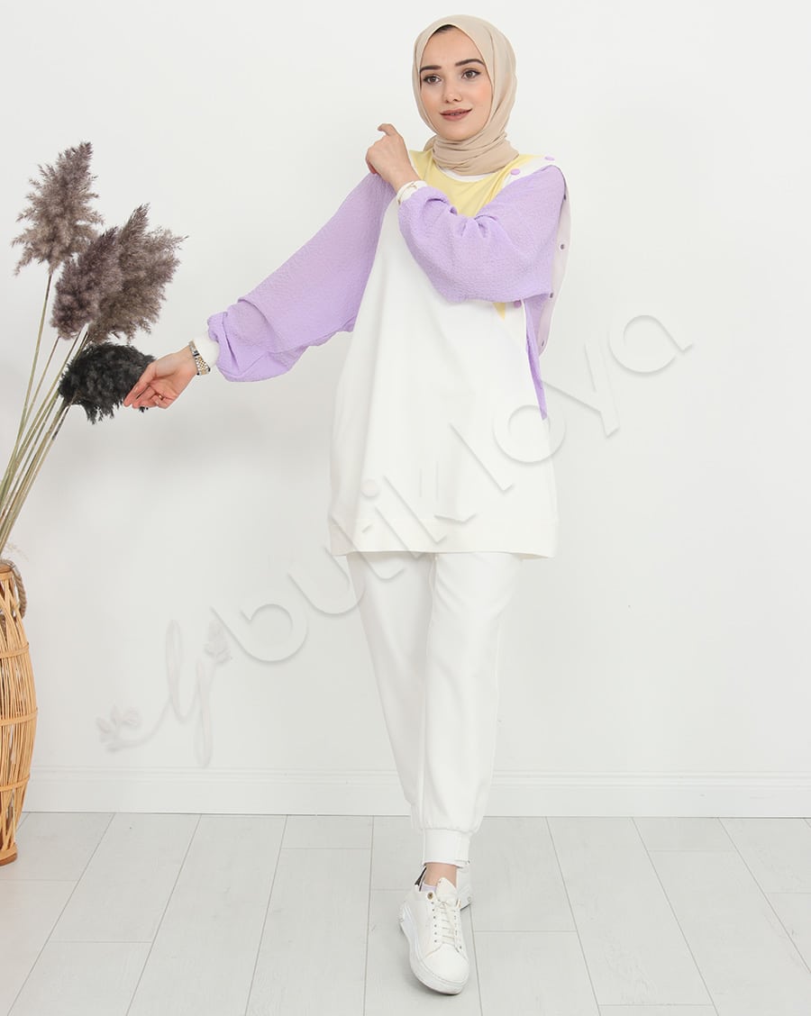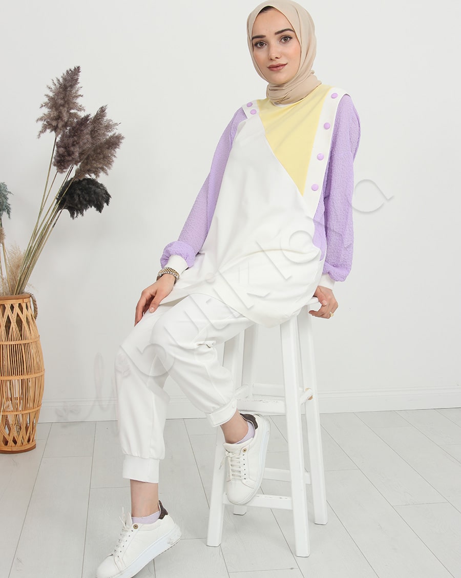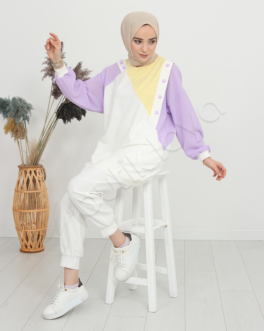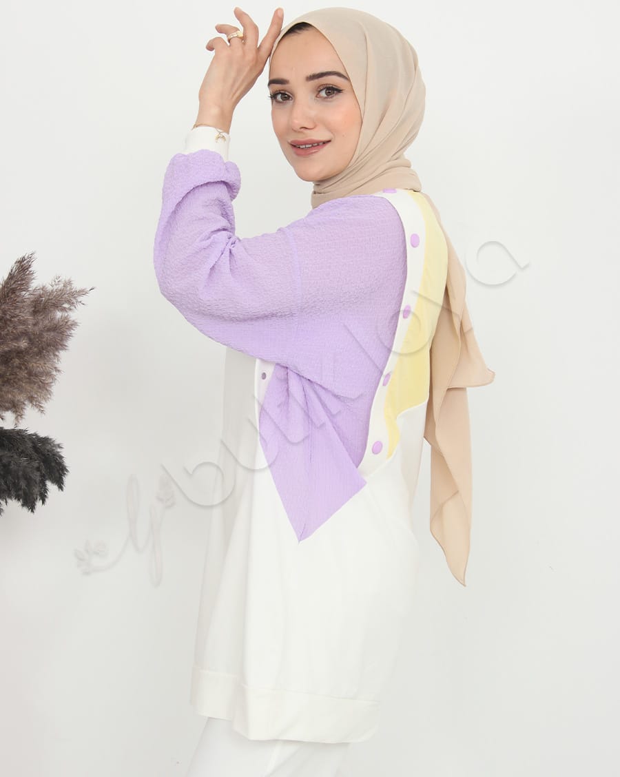 Ürün Özelliği: Asimetrik bir deseni olup omuz bölgelerinde çıtçıt düğme mevcuttur. Sarı, beyaz ve mor rengin uyumunu modern şekilde taşımaktadır. Hem şık hem de rahattır.