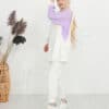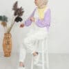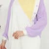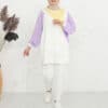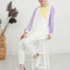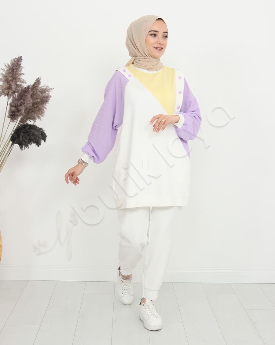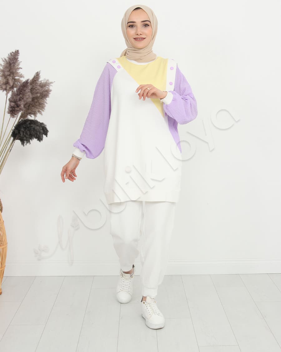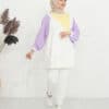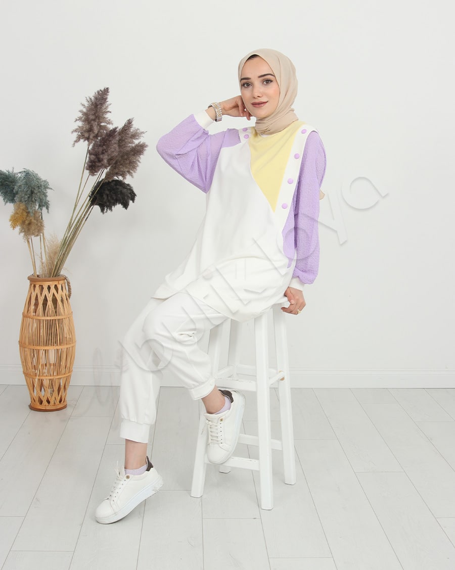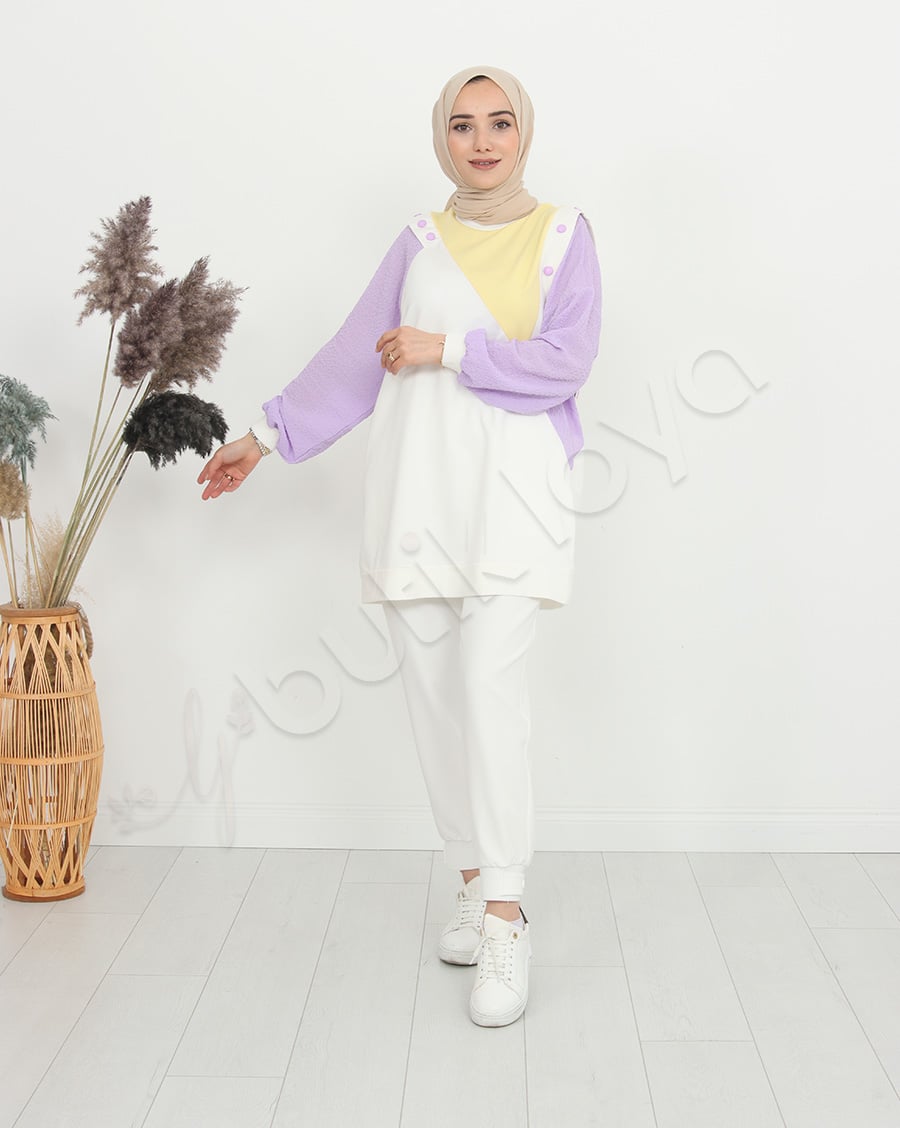 Ürün Özelliği: Asimetrik bir deseni olup omuz bölgelerinde çıtçıt düğme mevcuttur. Sarı, beyaz ve mor rengin uyumunu modern şekilde taşımaktadır. Hem şık hem de rahattır.