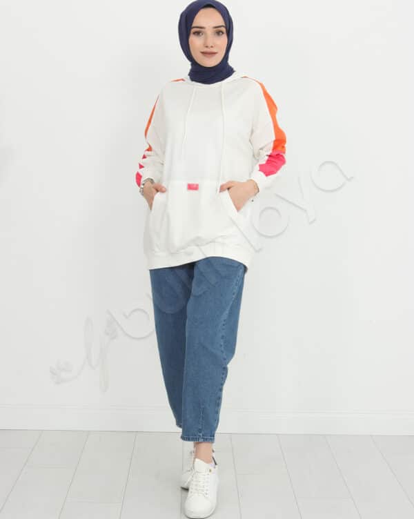 Ürün Özelliği: Önünde ve kapüşonun yanında fermuar detayı bulunmaktadır. Kollarında düğmesi vardır. Yanlarda cepleri mevcuttur. Kapüşon ipi canlı renklerden oluşmaktadır. Bu da tuniğe farklı bir hava katmaktadır.
