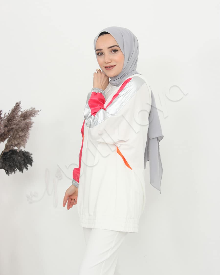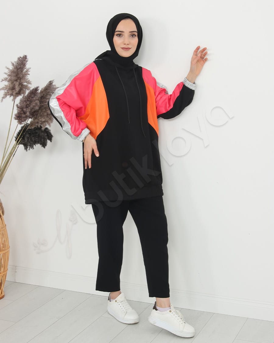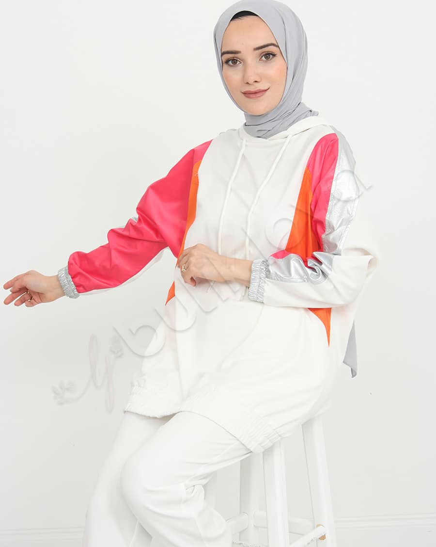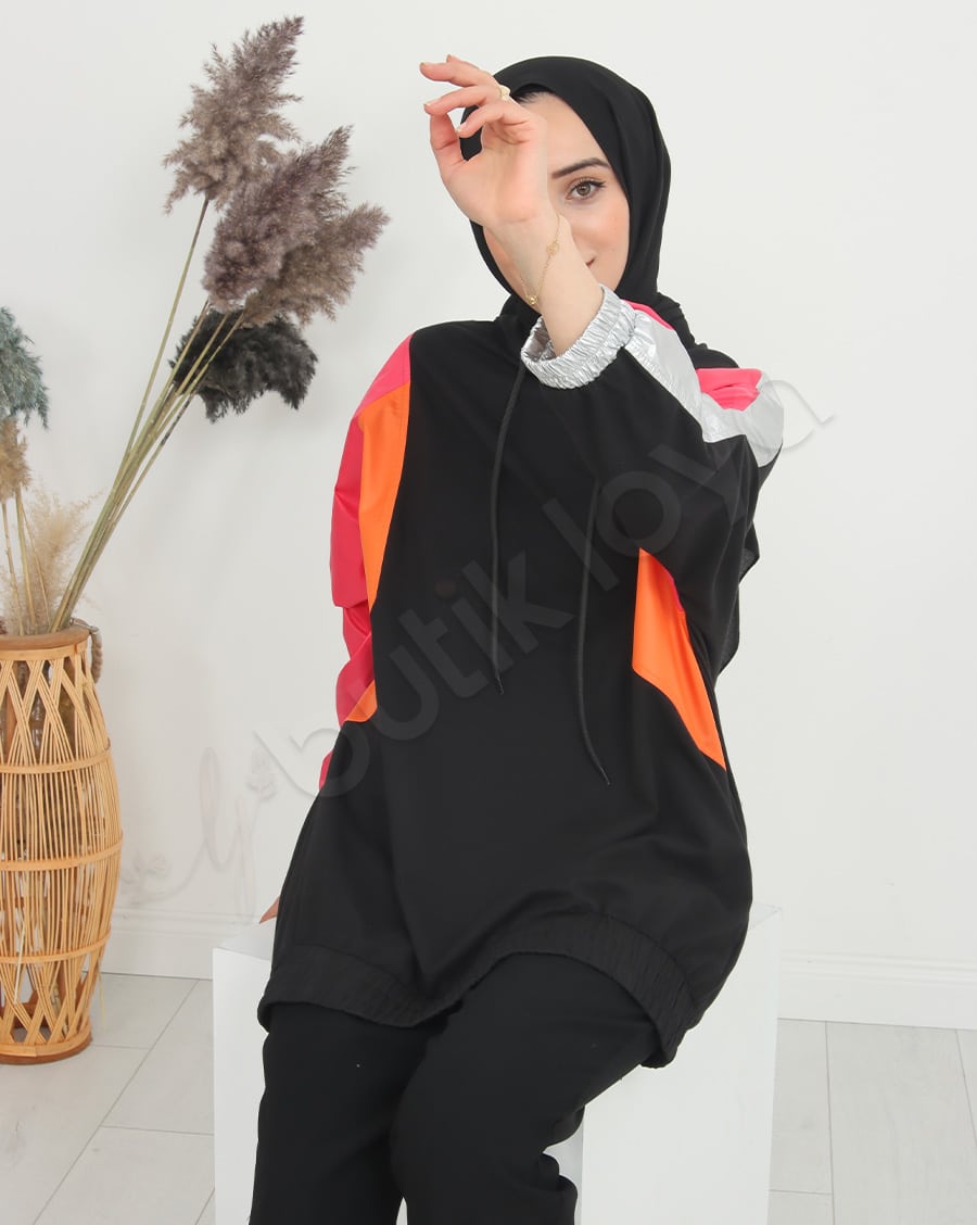 Ürün Özelliği: Kol bilekleri ve bitiş ucu lastiklidir. Omuzdan kola doğru parlak deseni mevcuttur. Üzerindeki desenler naylondandır. Ürün kapşonludur ve cepsizdir.