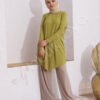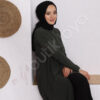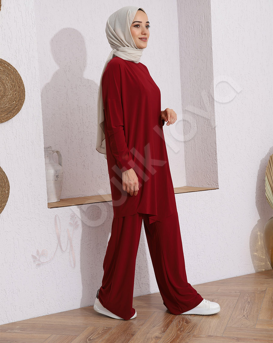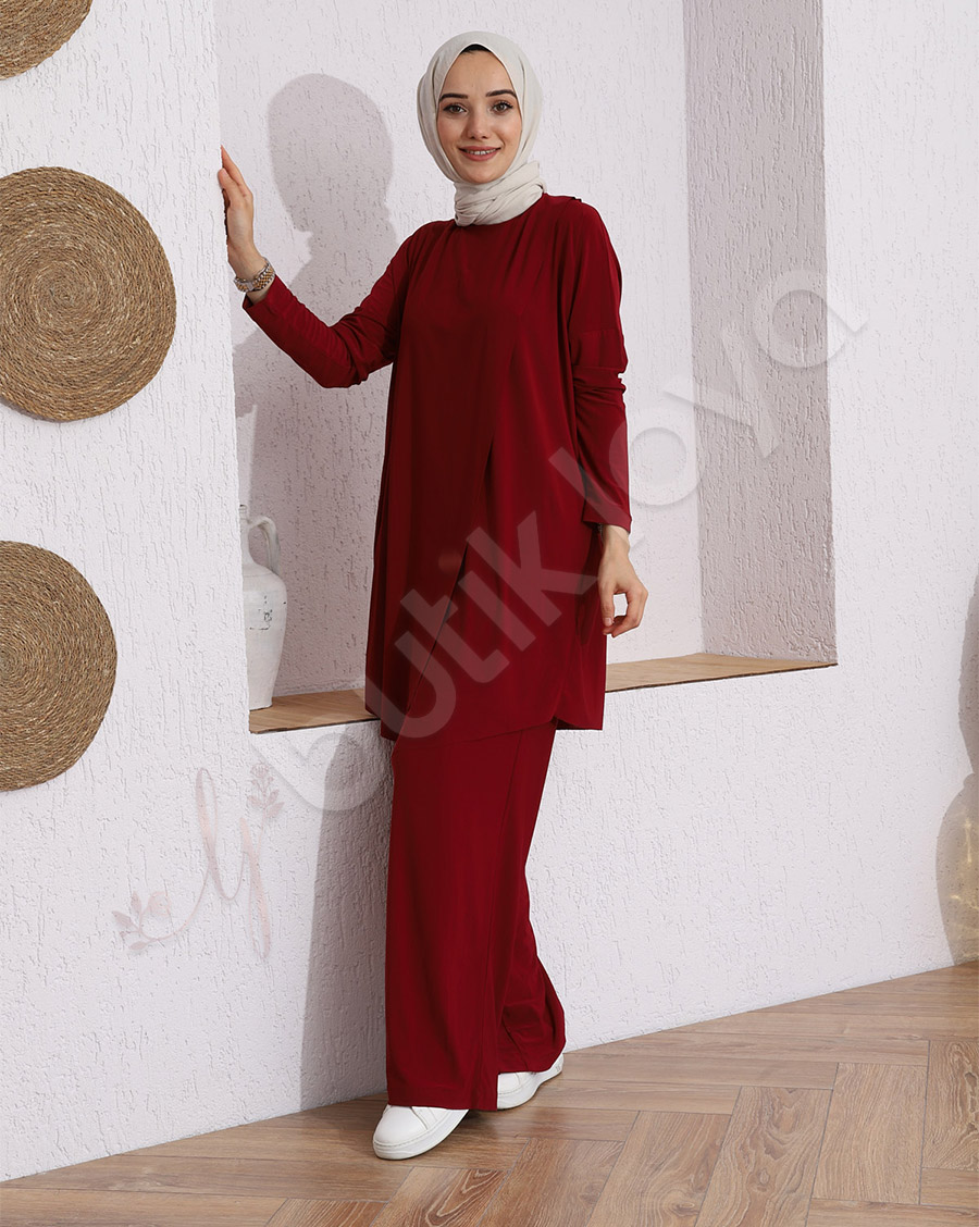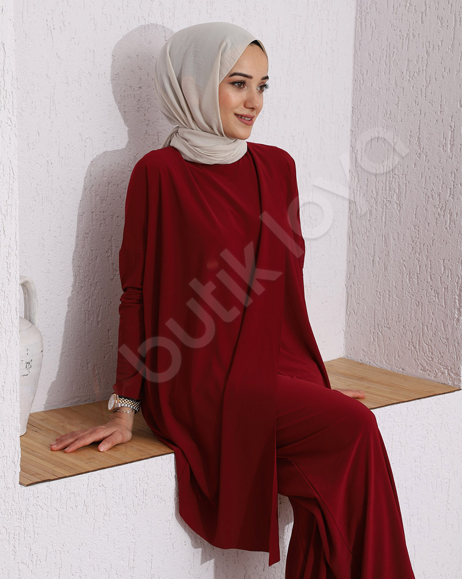 Ürün Özelliği: Ürün bisiklet yaka olmakla birlikte ön kısmı asimetrik kesim detaylıdır. Pantolon bel lastikli ve bol kesimlidir.Ürün tam kalıp ve astarsızdır.